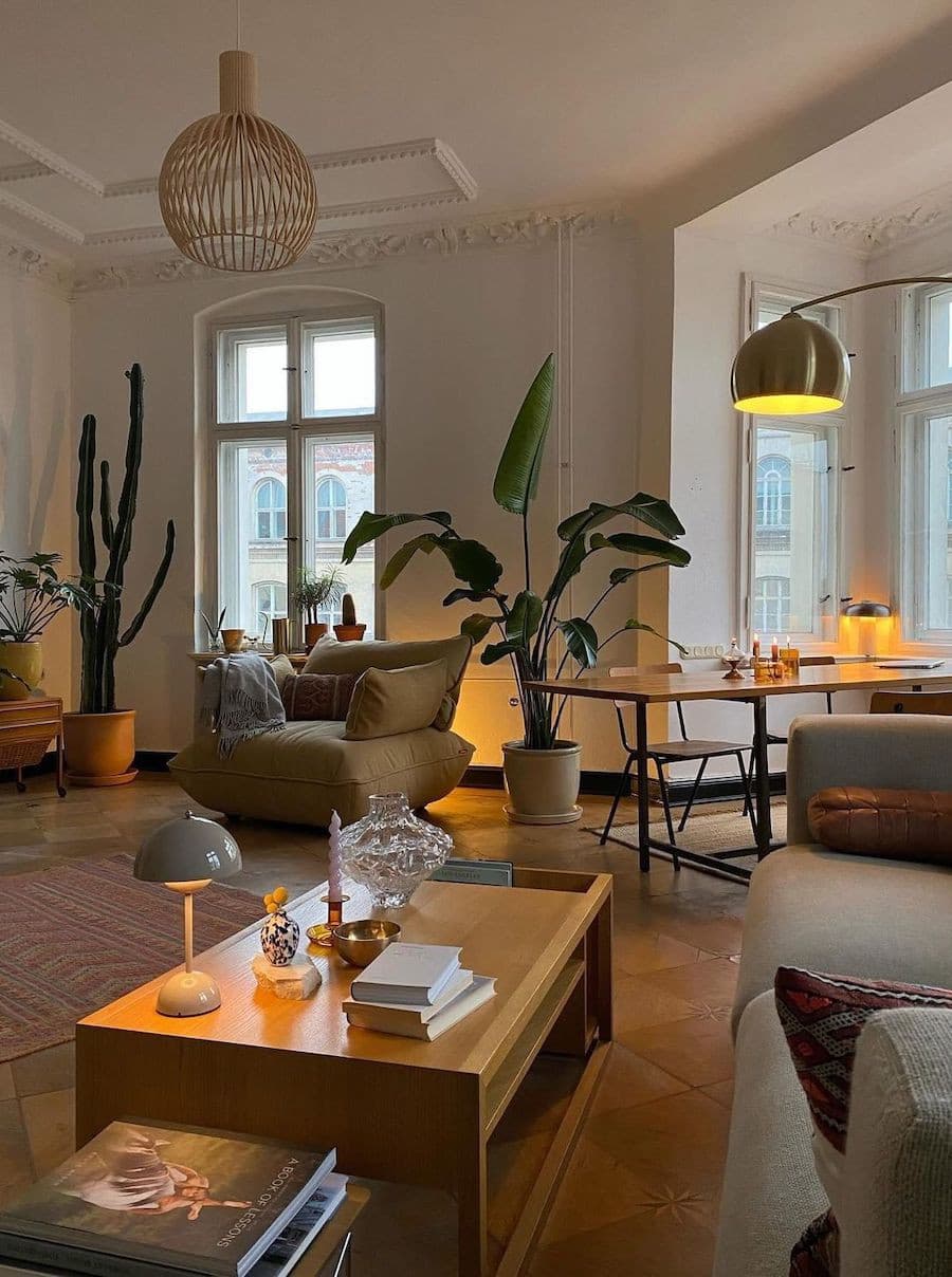 - Empieza combinando distintos tipos de lámparas: colgantes, de pie y de mesa, que aporten diseño e iluminación ambiental.